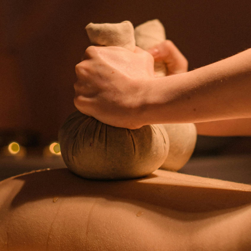 Après un massage Abhyanga, rétention locale d’huiles chaudes aux plantes sur la zone douloureuse (zone lombaire, genou). L’huile va pénétrer en profondeur et soulager les tensions de la zone.